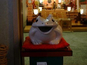 あまりにもかわいいので撮りました。 ここにはありとあらゆるところに いろいろなかえる様の置物がありました。 |