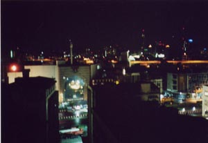 ホテルの部屋から。やや奥に高層ビルの光が見えた。 空港に着いたのが21:30。この闇の中、空港からホアランポーン駅行きの路線バス (なんと10円ぐらい)に乗って来た。 なかなか乗りたいバスに乗れず、時間は過ぎていき、正直あせった。 バスも1時間近くかかったかなー。 部屋で落ち着いてみれば夜の夜景も綺麗なんだけれど。 |