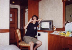 深夜12時ごろ、仙台からの長旅を経てやっと辿り着いたバンコクセントラルホテル。 近くのコンビに"セブンイレブン"で買ってきたシンハービールをぐいっと。 ここは日本で予約して行ったためやや高め(1人1300円)だった。 なんとエアコン・テレビ・朝食バイキング付き。でもシャワーの出は悪かった。 |