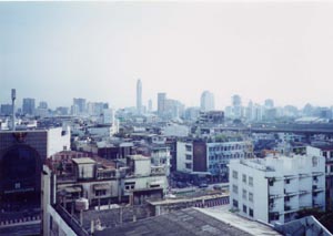 翌朝同じホテルの部屋から。街の様子が目に入る。 一面建物ばかりで高層ビルも立ち並ぶ大都市といった印象。 朝食を食べたあと、何はともあれ、シンガポールまでのマレー鉄道の切符を買うべく ホアランポーン駅へ向かった。 |