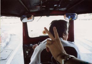 ホアランポーン駅の近くから乗ったバンコク名物トゥクトゥクにて。 行き先を告げると英語が分からんのか交番に行って道を聞いていた。 分からんなら乗せるなって。乗る前に駅でシンガポールまでの切符を買おうとしたのだが、 途中区間の空席が無く、日程に余裕が無いこともあり、その区間はバスで行くことに。 しかもバンコクを発つのはその日の14:45分。よってほとんどバンコクにはいなかった。 それにしても、そのバスのチケットを買った代理店にはやられました。 日程に余裕を持つか、事前に切符を手配するかしていなかったのが発端ではあるが。 |