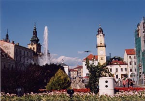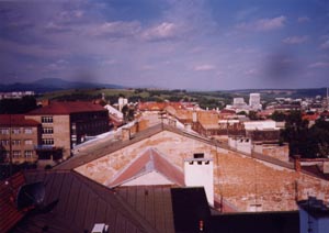 時計台上の展望台から。街の周りは山。電車の車窓からも思ったのだが、 小麦畑が一面広がっていたり、涼しかったり、スロバキアは北海道に似ている印象を受けた。 |