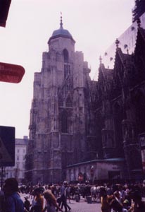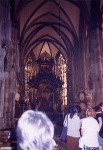 ステファン大寺院の内部。ステンドグラスにパイプオルガン。暗い感じがより歴史を しのばせてくれるように思う。 |