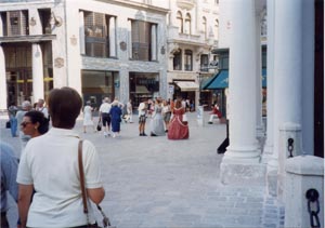 ウィーンの街角。モーツアルトがいた時代の格好をした人達がチケットを売っていた。 中心市街は石畳。 |