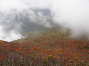 雲の合間にちらっと見える紅葉の山肌。 |
