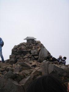 山頂。岩を積み上げた山頂に祠。あちらのお父さんは30年ぶりの登頂達成。 |