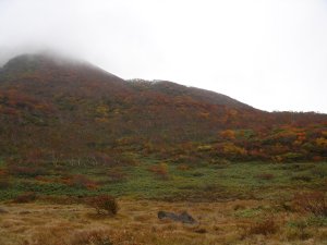 お花畑から山頂を仰ぎ見る。シーズンがシーズンなので花はほとんどなし。裏磐梯側の眺望がいいので、 ちょっと回り道することをお勧め。 |