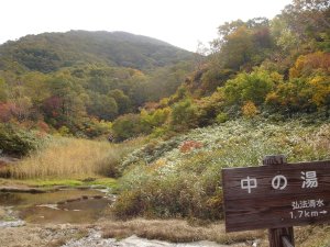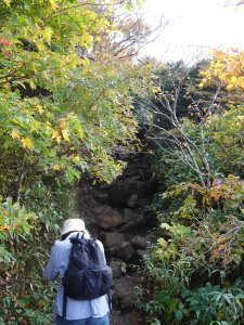 中の湯からは登山道らしい道に。色付いた木々の中を歩く。 枝が低くなってくると、後ろに背負ったユンに当たるので慎重に。 |