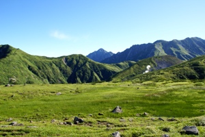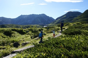 | 剣岳を見ながら歩く気持ちのいい道。子供でも歩ける、なだらかな整備された遊歩道が続く。 |