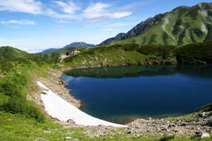 | 大観峰からの後立山連峰と黒部湖を望む。秋の紅葉シーズンが最も混雑するとか。 |