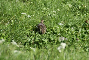 | ミクリガ池のほとりで見かけた雷鳥。子供達が見つける前に草むらの中へ。保護色なんで見つけにくいよね。 |