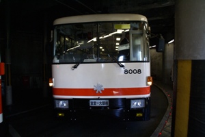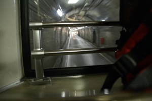 黒部ダムへ向かってトンネルの中を走るトロリーバス。