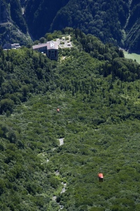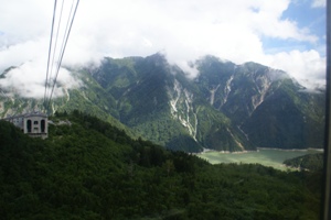 | ガイドブックを売るロープウェイの綾小路きみまろ風の駅員曰く、“走らない(柱無い)ロープウェイ”。 なんでも雪崩対策だとか。こんな日には想像ができない厳しい自然環境なんだろうね。 |