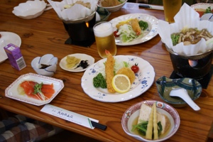 | 夕食。ご飯もビールも美味い。残念ながら夕陽は見れず。 |