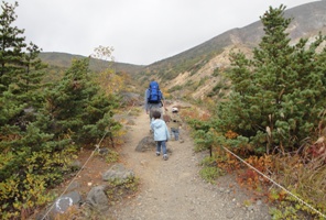 | 子供たちと共に登山道を歩く。まだ元気なユン&リョン。 |