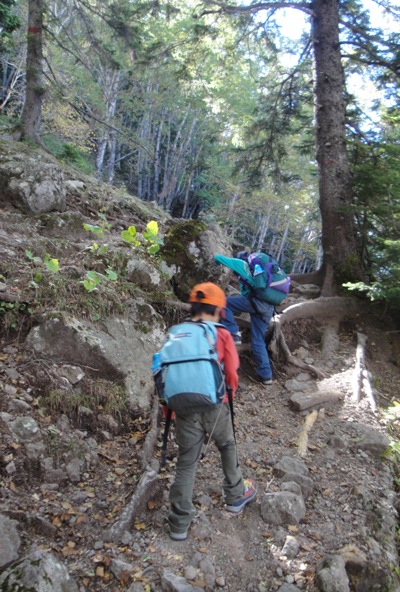 | あまり斜度のない樹林の中を比較的快調にすすむ子供たち。 |