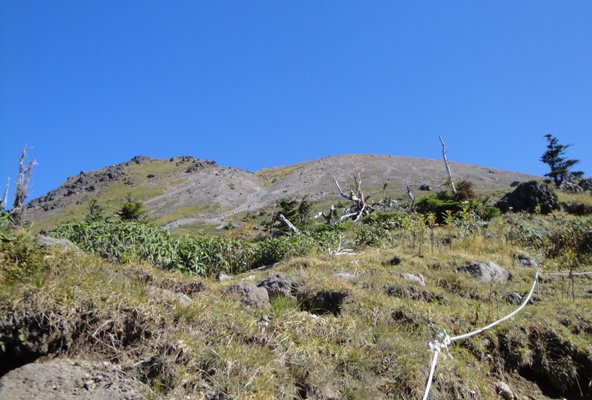 | 樹林帯を抜けると一気に視界が開けて山頂が目の前。青い空、気持ちいい! |