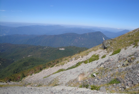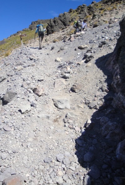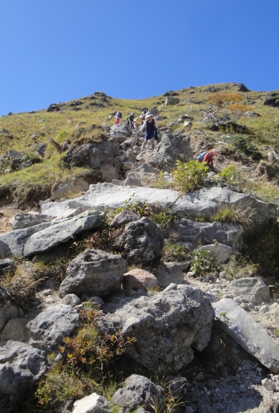 | ザレ場の滑りやすい急坂の道。歩きにくいが景色がいいのであまり苦にならず。 |