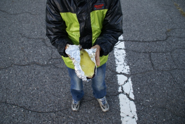 | 夏スキーに来ていた隣の車中泊の方から焼き芋をいただいた。寒い朝に温かい焼き芋が美味しかった。 |