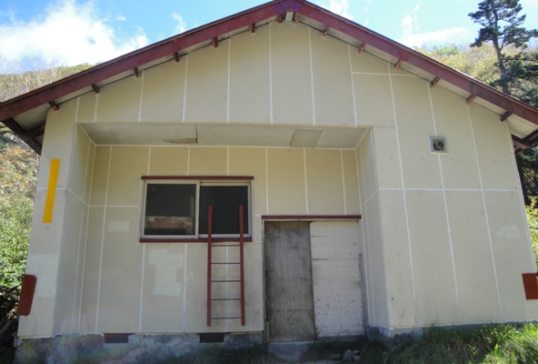 | 五色沼避難小屋。窓に梯子かかっているのは冬場用だろうか。 |