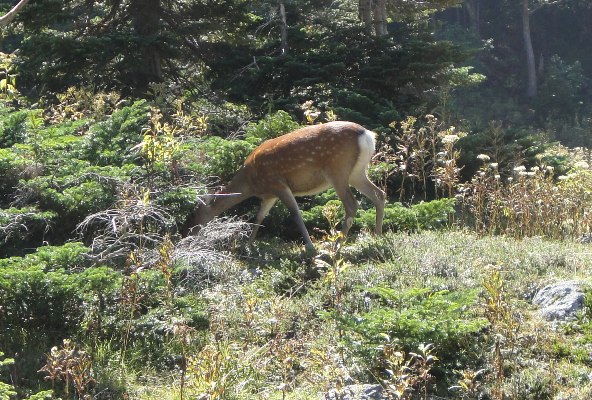 | 五色沼横で鹿に遭遇。全然逃げないのね。 |