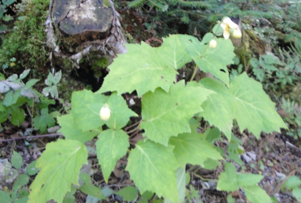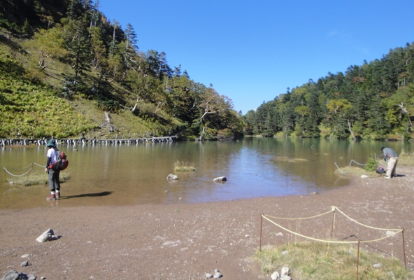 | 五色沼へ下る道。結構急坂で滑りやすく、子供は何度かこけていた。 嫁さんの苦手な急坂、今回からストックを使っていてこれまでよりは快調? |