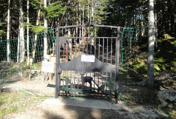 | 鹿対策の入口のゲート到着。七色平の手前くらいからロープウェイに 乗れないことを恐れた子供たちが急にスピードアップしたので余裕をもって到着。 |