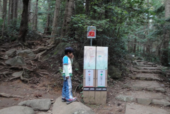 | 白雲橋コースと迎場コースの分岐。ここからはなだらかな完璧に整備された道。 トイレに行きたくなった次男坊、あと一息だよー。 |