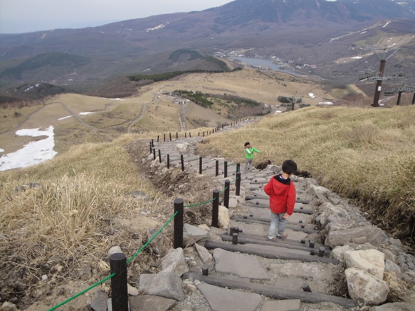 | 車山乗越に向けてリフト横の階段を下りる。 下りは早い子供たち |