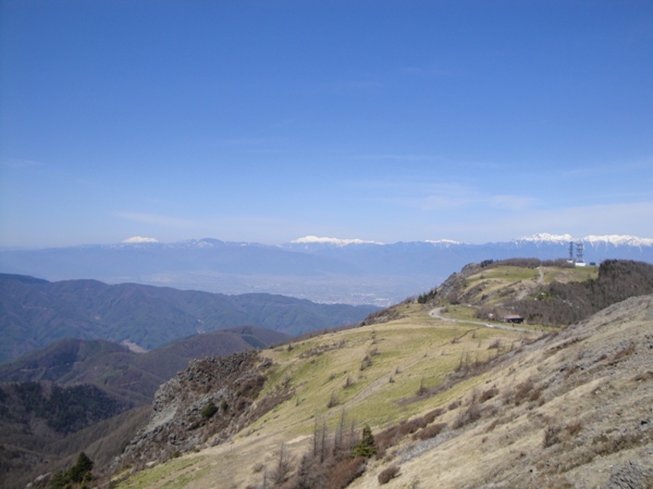 | ホテルの裏が山頂。 北アルプスが少し近くなった。 右奥に見える鉄塔の場所が王ヶ鼻。 |