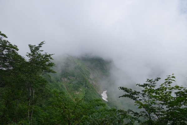 切り立った山肌と雪渓。 豪雪にえぐられた地形かな。 |