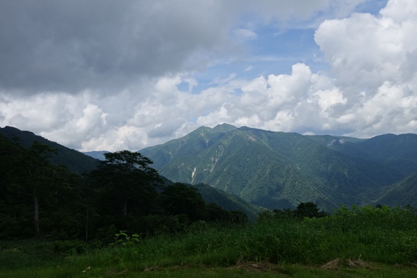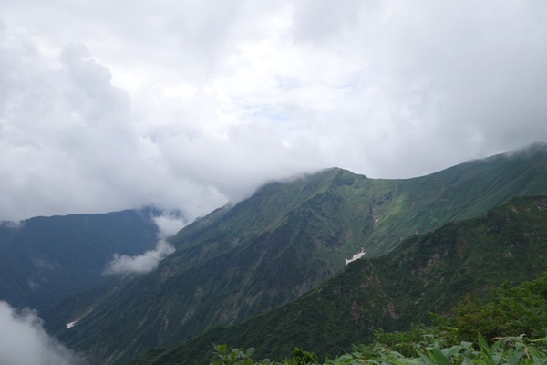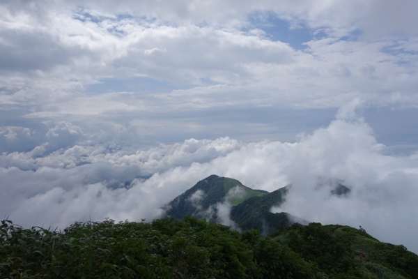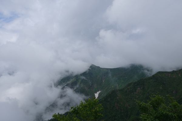 万太郎山方面の稜線が見え、テンションが上がる。 晴れてくれないかな〜。 |
