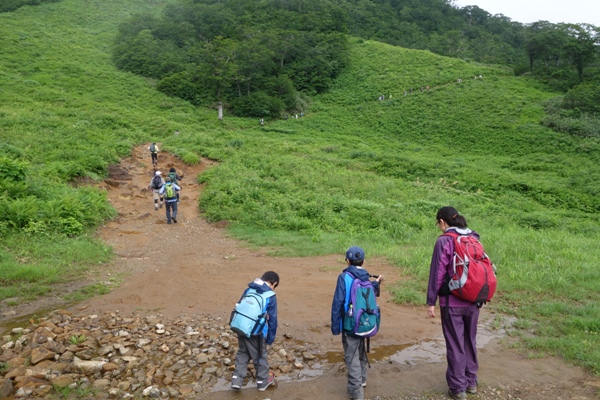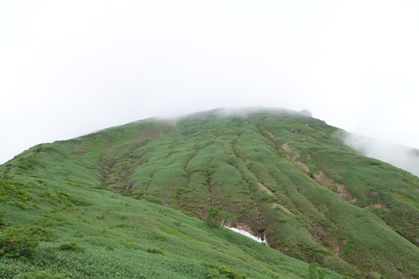 天狗の溜まり場から山頂を望む。 熊笹に覆われた緑がきれい。 |