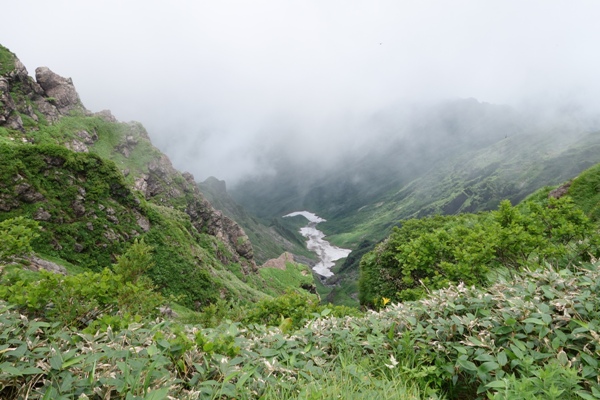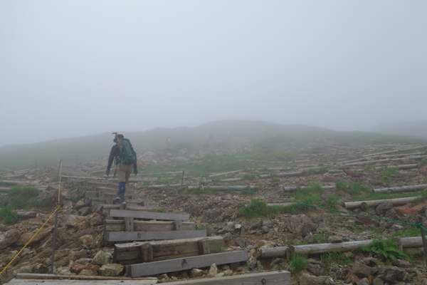 ガスが晴れないかもう少し待ちたかったが、11時半ごろ下山開始。 |