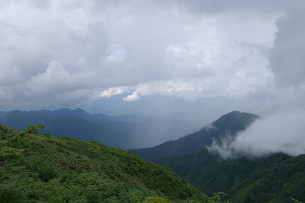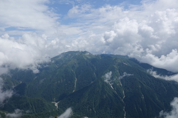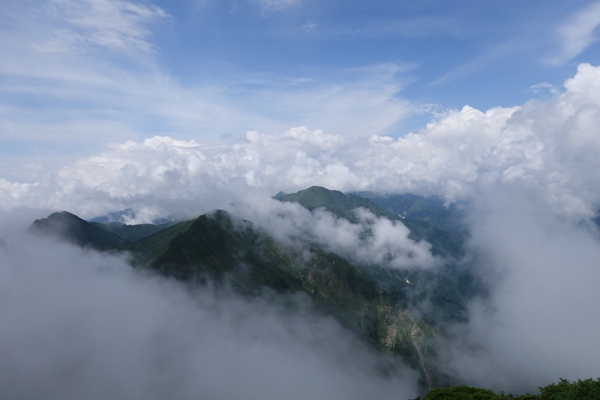 万三郎山方面の晴れ間。 とがった峰が続く稜線がかっこいい。 |