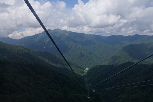 朝はガスの中で何も見えなかったロープウェイの全貌が見えた。 歩けば往復4時間ほどの道のりもあっという間、軟弱者も楽しめる山になってるのはロープウェイのおかげですねえ。 |