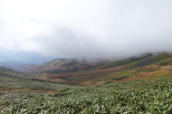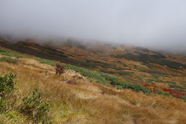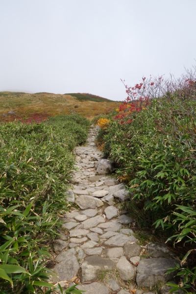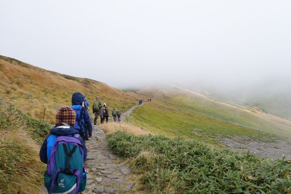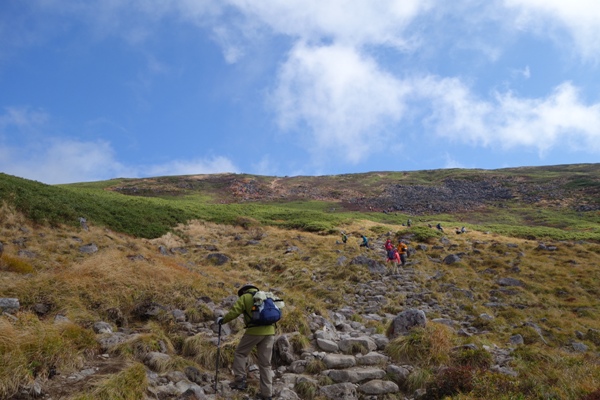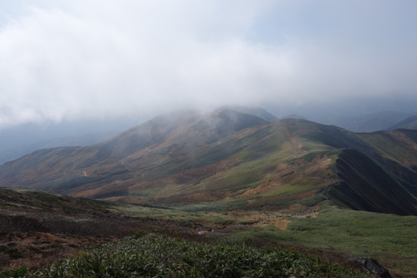 姥ヶ岳から月山へ続くなだらかな道。 登山者が多い。 |