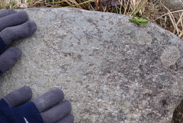 バッタ発見。長男が触ってもあまり動かず。もう寒い時期だし弱ってるのかな? |