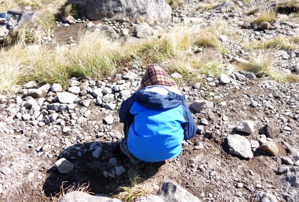 昼食中もいじけている次男坊。 山頂付近までガスで展望がなく風も強くてテンションが上がらなかったよう。 |