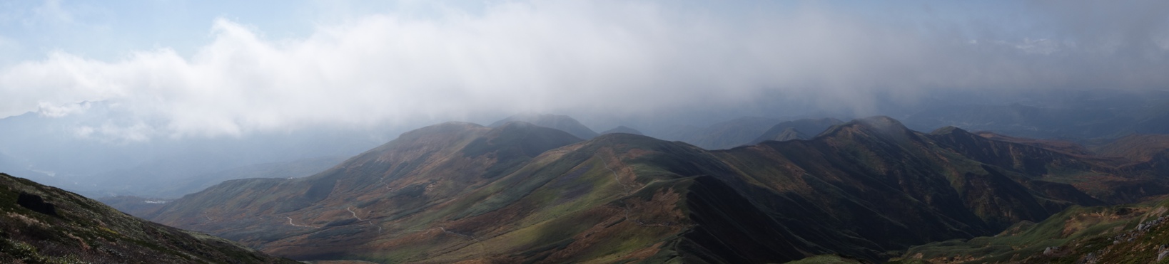 姥ヶ岳〜湯殿山へ続く稜線がきれい。 |