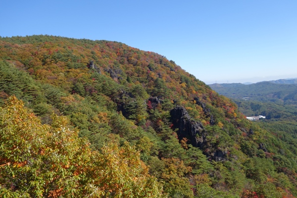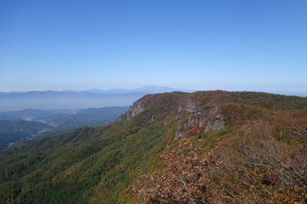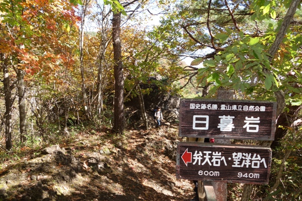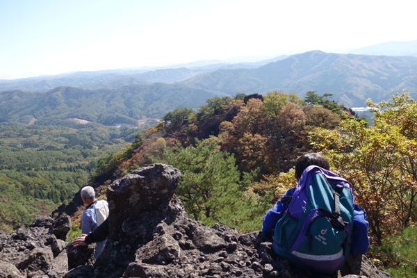 しばらく下って日暮岩から天狗岩(中央付近)を望む。 天狗岩の上にも登れるようだが今回は行かず。 |