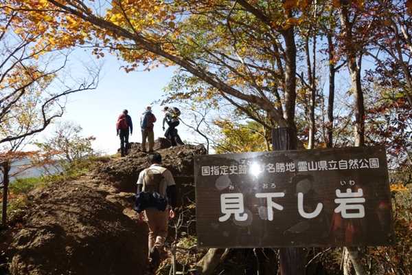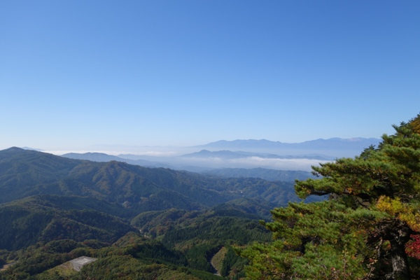 広場は眺望がないが、すぐ横の西物見岩からは色付き始めの木々。 |
