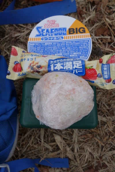 昼食はカップラーメン、おにぎり、満足バー。 日が差さず寒いのでカップラーメンで温まる。 |