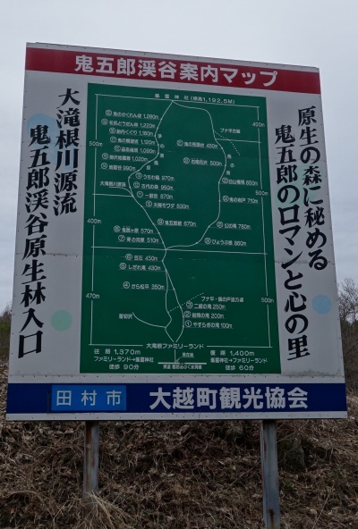 あだたら高原ホテル跡への入り口にある看板。 鬼五郎渓谷っていうんですねー。 |