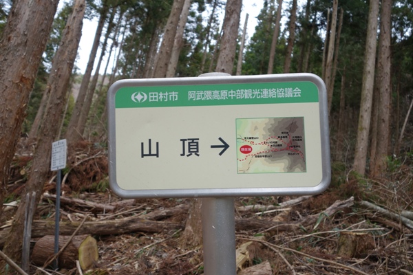 真新しい看板。 山頂まで樹木の名前を説明する小さな看板やテーピングがあり、それらを頼りに山頂へ。 |