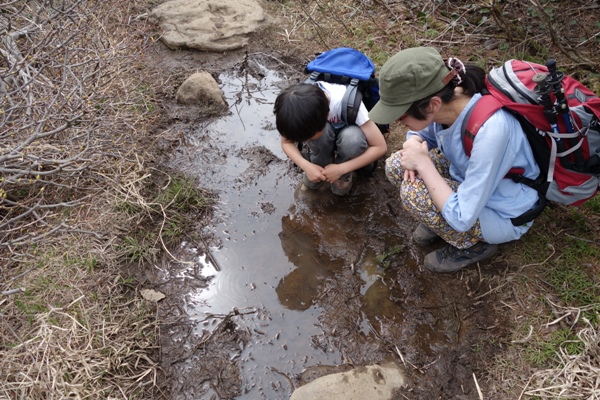 アメンボを観察する母子。 水たまりが干上がったらどうなるんだろ? |