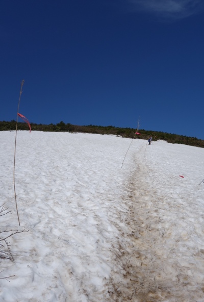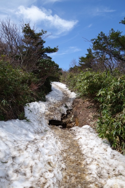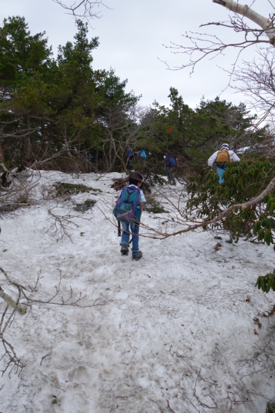 踏み抜きそうな残雪の上を進む。 次男は相変わらずブツブツ言いながら何とか歩く。 |