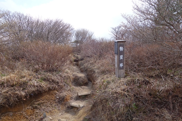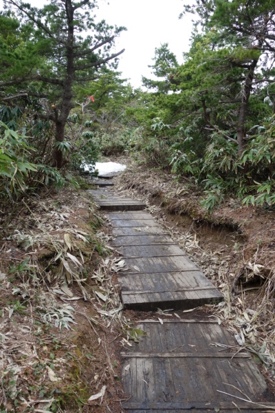 すぐに雪が消えた木道が出てきたためアイゼンを外す。 この後も雪が出たり消えたりでアイゼンの脱着が面倒なため装着せず。 |