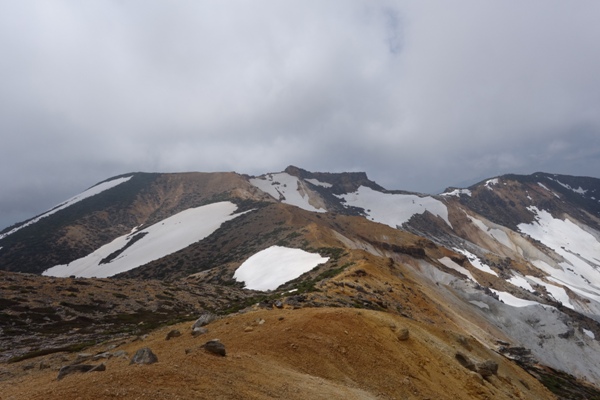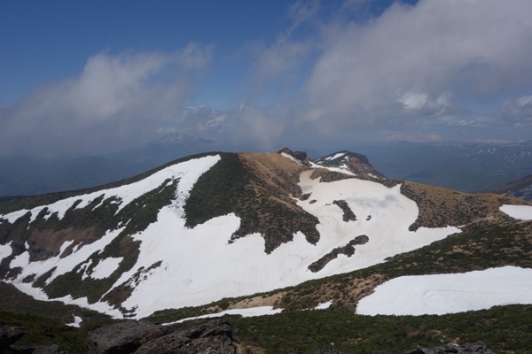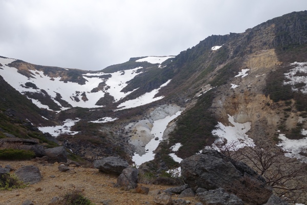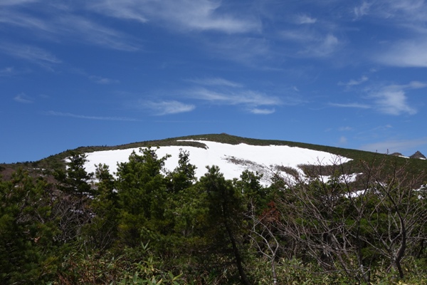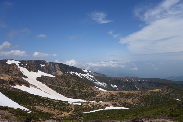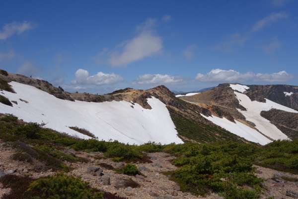 視界が開けてきた。 まだらな残雪がいい感じ。 |