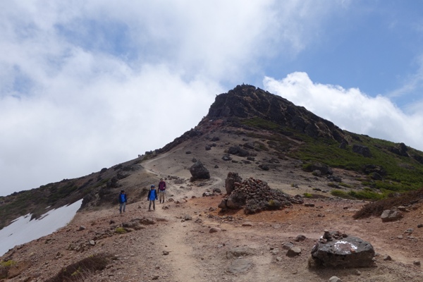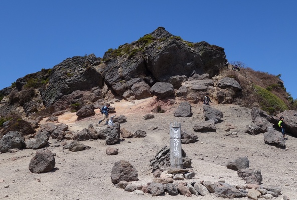 薬師岳到着。 動き出したゴンドラに乗ってきた方たちとも合流。 ゴンドラで10分のところ、歩いて1時間半・・・ |